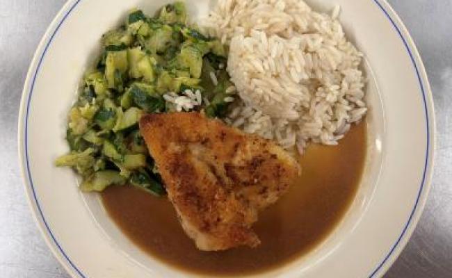 Menu & Snack of the day SOUPE : Tomate Schnitzel de volaille, courgettes, riz Dessert : Melon MENU VÉGÉTARIEN : Chakchouka aux oeufs, courgettes, riz Allergènes : gluten (volaille)