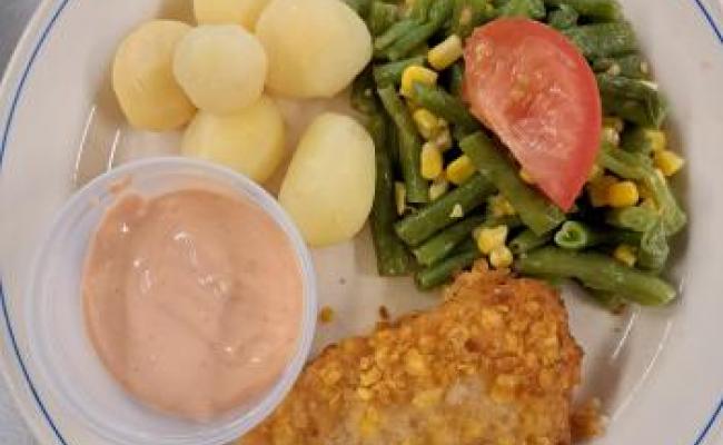 Menu & Snack of the day Potage aux oignons Colin aux cornflakes, salade de haricots verts, pommes de terre vapeur, sauce cocktail Dessert : clémentine MENU VÉGÉTARIEN : Omelette, salde de haricots verts, pommes de terre vapeur Allergènes : oeufs (sauce) gluten (colin) poisson moutarde (colin - sauce)