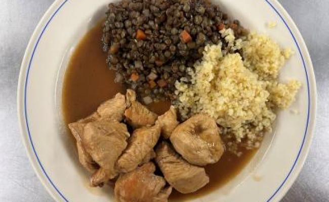 Menu & Snack of the day SOUPE : Carottes Cube de dinde, lentilles cuisinées, boulghour Dessert : Prune MENU VÉGÉTARIEN : Butternut braisé, lentilles cuisinées, boulghour Allergènes : gluten (boulghour) Traces de : céleri (dinde) soja (dinde)