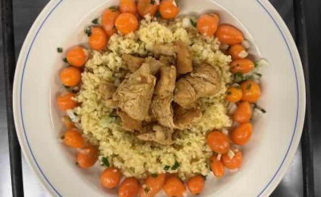 Menu & Goûter du jour SOUPE : Céleri Cubes de poulet, carottes parisienne, boulghour BIO Dessert : Mandarine MENU VÉGÉTARIEN : Navarine de légumes aux raisins, carottes parisienne, boulghour BIO Allergènes : gluten (boulghour) Traces de : céleri (poulet)