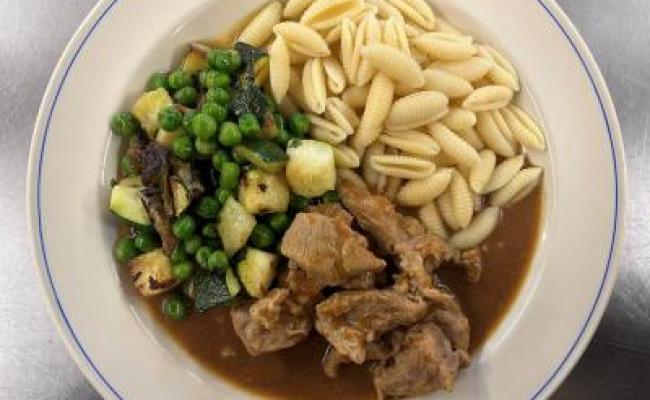 Menu & Snack du jour SOUPE : Andalou Etuvé de veau, pois et courgettes, gnocchettis Dessert : Melon MENU VÉGÉTARIEN : Gratin de gnocchettis, pois et courgettes Allergènes : céleri (veau) oeufs (gnocchettis) gluten (veau - gnocchettis) Traces de : oeufs (veau) moutarde (veau)