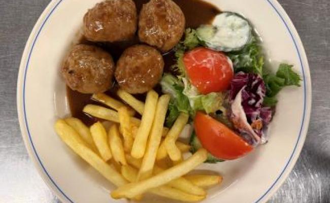 Menu & Snack du jour SOUPE : Velouté de champignons Boulette liégoise, frites, salade de saison Dessert : Banane MENU VÉGÉTARIEN : Omelette, frites, salade de saison Allergènes : oeufs (boulette - salade) moutarde (salade)