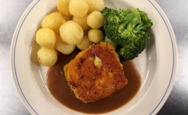 Menu & Snack du jour SOUPE : Velouté de tomate et boulette de volaille Cordon bleu de poulet, brocolis, pommes de terre sautées Dessert : Glace MENU VÉGÉTARIEN : Poivron farçi, brocolis, pommes de terre sautées Allergènes : céleri (soupe) gluten (poulet) lait (soupe - poulet - dessert) Traces de : soja (soupe)