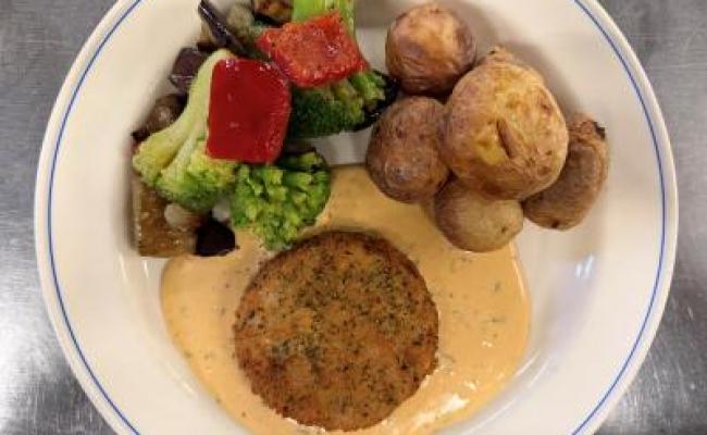 MENU VÉGÉTARIEN : Galette de choux fleur au fromage, sauce choron, légumes grillés, grenailles