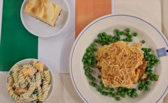 Menu & Snack of the day Salade irlandaise Irish Shepherd's pie, petits pois Dessert : Irish apple cake MENU VÉGÉTARIEN : Parmentier végétarien, petits pois Allergènes : céleri (salade) oeufs (salade - dessert) gluten (pie - dessert) lait (salade - pie - dessert) moutarde (salade) fruits à coque (dessert) Traces de : céleri (pie)