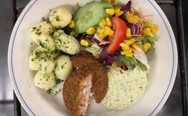 Menu & Snack of the day SOUPE : Lentilles Burger de saumon, sauce tartare, salade de saison, pommes de terre persillées Dessert : Pomme MENU VÉGÉTARIEN : Burger vegan, sauce tartare, salade de saison, pommes de terre persillées Allergènes : oeufs (sauce - salade) gluten (saumon) poisson moutarde (sauce - salade)