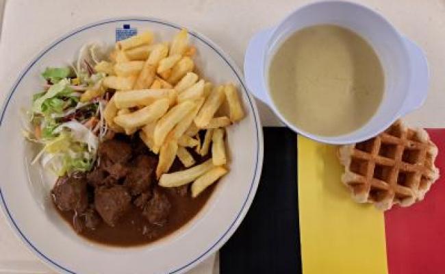 Menu & Snack of the day Potage : Velouté de chicon Carbonnade de boeuf à la flamande, salade de saison, frites Dessert : Gaufre liégeoise Menu végétarien : Boulette végétarienne, sauce tomate, frites Allergènes : lait : (velouté) gluten : (carbonnade - gaufre) oeuf : (salade - gaufre) moutarde : (carbonnade - salade) Traces de : lait : (gaufre)