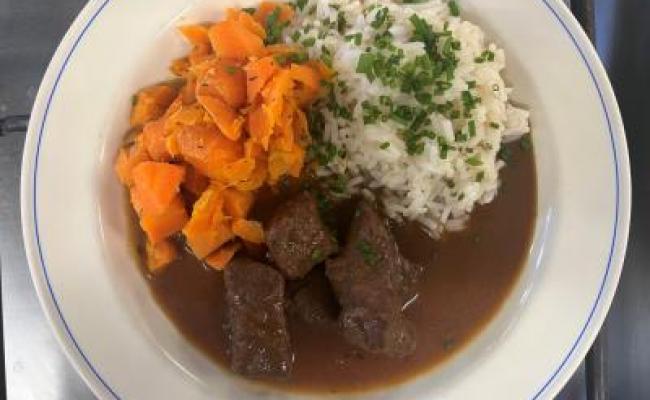 Menu & Goûter du jour SOUPE : Céleri Boeuf bourguignon, carottes au thym, riz Dessert : Orange MENU VÉGÉTARIEN : Gyros vegan, carottes au thym, riz Allergènes : céleri (boeuf) Traces de : gluten (boeuf) moutarde (boeuf)